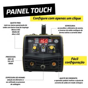 - Para o processo MIG é possível soldar sem gás, com a sinergia eletrônica facilita a operação do equipamento, mesmo sem experiência é fácil de soldar e com a inovador Tocha Nine-Conector de engate rápido e plug duas vias é simples a conexão, tocha leve e resistente para aplicação da soldagem, a fonte tem capacidade de suportar rolos de 1 kg de arame.