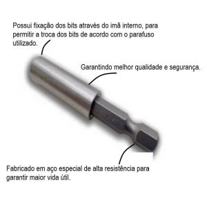 Garantindo alta qualidade, Suporte Para Bits Magnético Possui encaixe sextavado externo de 1/4″. Possui fixação dos bits através do imã interno, para permitir a troca dos bits de acordo com o parafuso utilizado. Fabricado em aço especial de alta resistência para garantir maior vida útil. Compre já o seu!