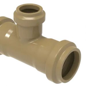 Conexão Tê de Redução em PVC, ideal para sistemas de adução de água. Projetado para derivar uma tubulação de DN100 para DN50 com segurança e eficiência, utilizando junta elástica para uma instalação prática e segura.