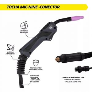 - O conector Nine-Conector, com engate rápido e plug de duas vias, simplifica a conexão da tocha, enquanto sua construção leve e resistente torna-a ideal para diversas aplicações de soldagem.