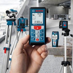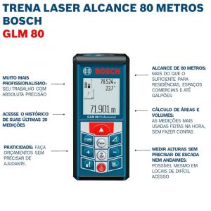 - A trena a laser Bosch GLM 80 é um medidor de distâncias a laser com alcance de até 80 metros com capacidades 3 em 1.