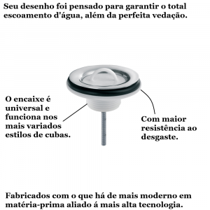 - Seu desenho foi pensado para garantir o total escoamento d'água, além da perfeita vedação. O encaixe é universal e funciona nos mais variados estilos de cubas.