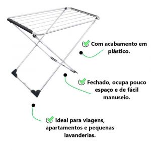 - Ideal para viagens, apartamentos e pequenas lavanderias. Varal conta com acabamento plástico contra arranhões e ferrugem.