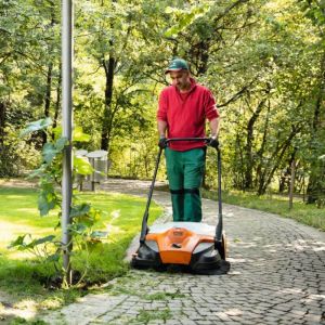 Varredora a bateria Stihl KGA 770, limpa áreas médias e grandes sem fio, com escovas laterais para cantos, design leve e ergonômico, ideal para folhas e detritos, oferece praticidade e conforto em ambientes internos e externos.